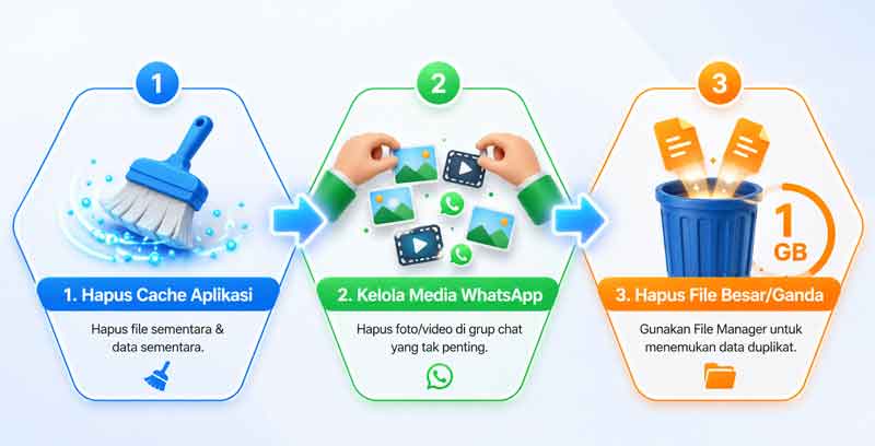 - Selalu backup data penting (chat WhatsApp, foto) sebelum membersihkan dalam jumlah besar.